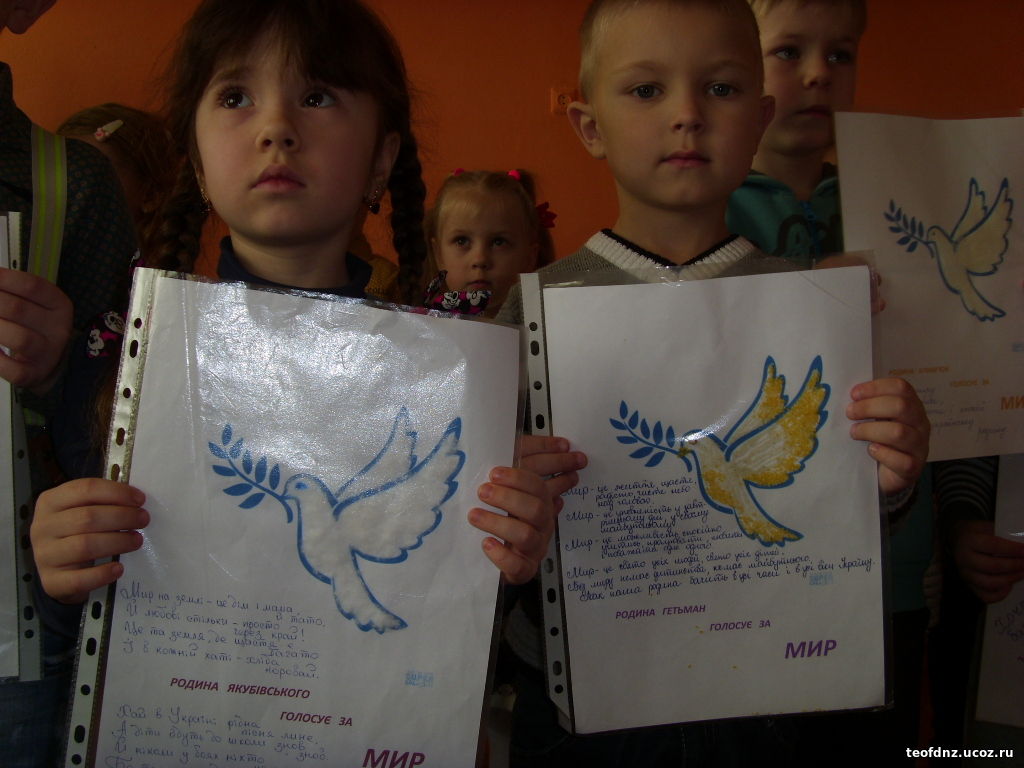Такими словами розпочалася акція «Ми голосуємо за МИР», що відбулася 03 березня 2017 р. у Теофіпольському дошкільному навчальному закладі №3 «Бджілонька», де завідувач Шовкомуд З.В. До акції були залучені педагоги, вихованці, батьки. Шанувати і любити свою прекрасну, рідну неньку-Україну, шанувати славні традиції, звичаї нашого народу, пам’ятати завжди і скрізь, що український народ – великий народ, що не скоривсь ні мечу, ні кулеметному вогню, не скориться «градам» - така мета заходу. Є у нас свята віра - віра у світле майбутнє своєї держави.
